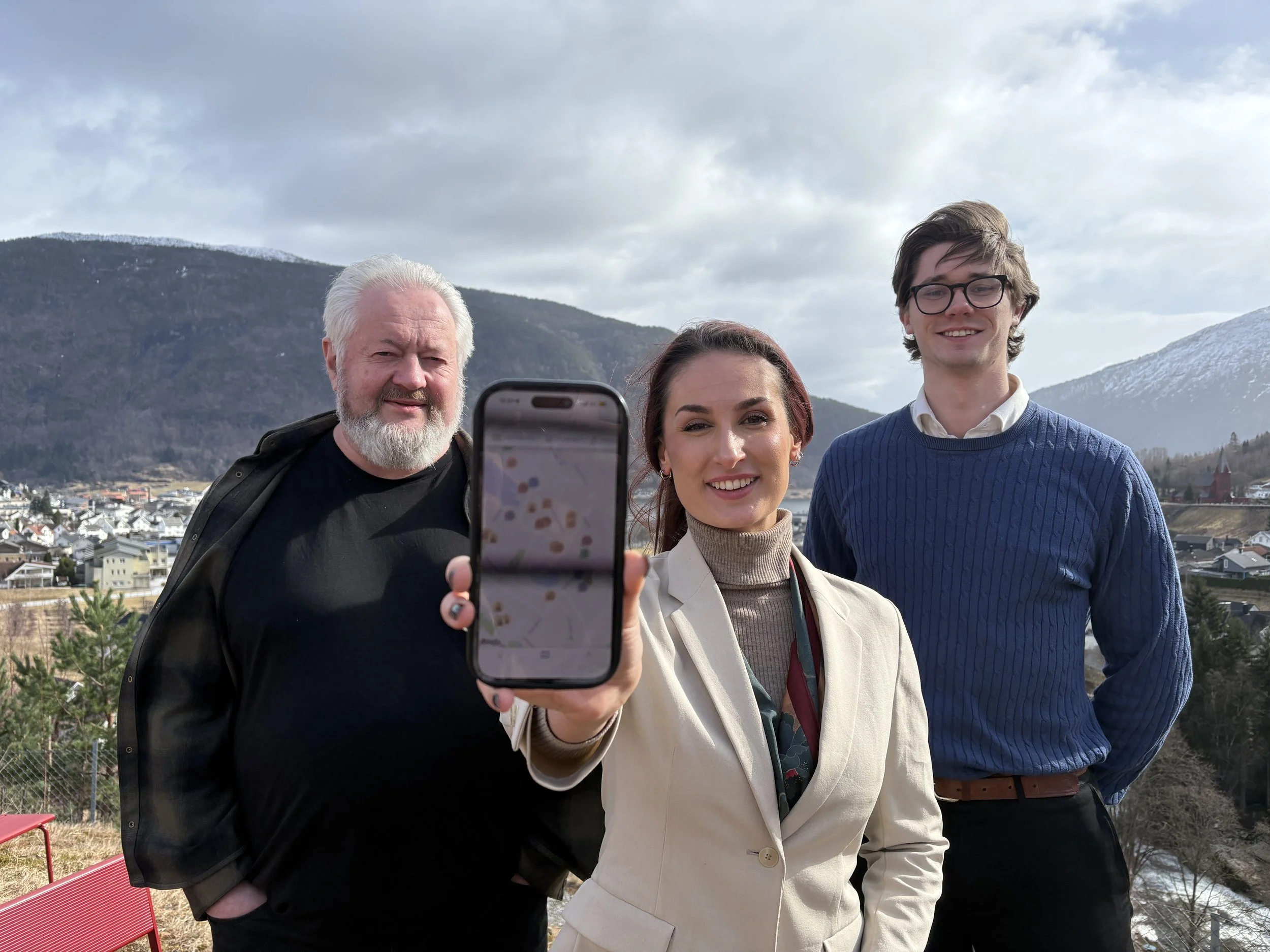 Appen Kulturjakten skal utviklast vidare ved hjelp av KI. FoU-samarbeidet involverer Link Utvikling i Bergen og Vestlandsforsking i Sogndal. Frå venstre: Ivar Petter Grøtte (forskar), Hana Colakovic (dagleg leiar) og Eirik Aasen (prosjektleiar). Foto: Sogn Avis