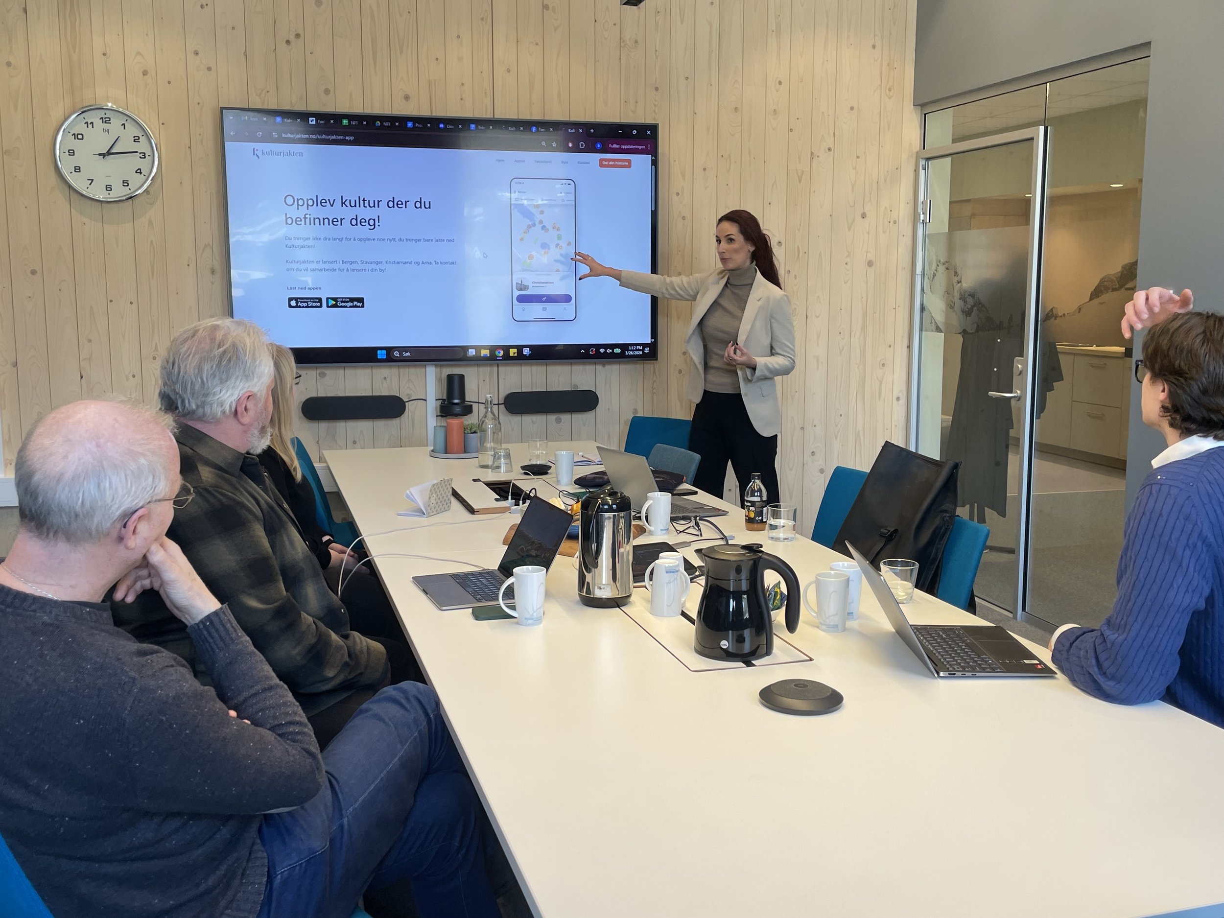 Hana Colakovic viser korleis appen Kulturjakten fungerer. Ved bordet sit (f.v.) Mari Hanssen Korsbrekke, Ivar Petter Grøtte, Carlo Aall og Eirik Aasen. Foto: Idun A. Husabø